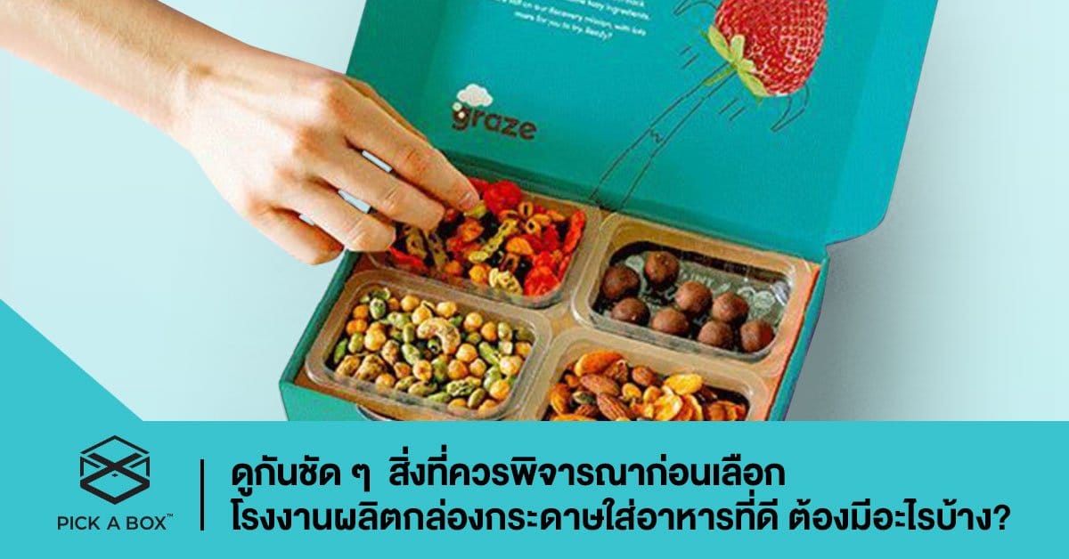 โรงงานผลิตกล่องกระดาษใส่อาหารที่ดี ควรมีการผลิตที่เป็นไปตามมาตรฐานของหน่วยงานที่เกี่ยวข้อง เช่น มาตรฐาน FSC (Forest Stewardship Council) มาตรฐานการรับรองจากองค์กรนานาชาติที่ช่วยผลักดันและสนับสนุนการดูแลป่าไม้ทั่วโลกอย่างมีความรับผิดชอบต่อสิ่งแวดล้อมเพื่อให้มั่นใจได้ว่ากล่องกระดาษผลิตด้วยกรรมวิธีที่ถูกกฎหมาย มาตรฐาน FDA (Food and Drug Administration) ซึ่งมีความเคร่งครัดในการตรวจสอบผลิตภัณฑ์ต่างๆเป็นอย่างมากของสหรัฐอเมริกา เปรียบเหมือนกับ องค์การอาหารและยา หรือ อย.ของประเทศไทยนั่นเอง นอกจากนี้ โรงงานผลิตกล่องกระดาษใส่อาหารที่ดี จะมีการนำเสนอนวัตกรรมหรือเลือกสิ่งที่ดีที่สุดในการผลิตที่คุ้มค่าให้คุณ มีชิ้นงานตัวอย่างให้ดูและปรับแก้ก่อนการผลิตจริง ทั้งยังควรมีการกำหนดราคาที่เหมาะสมและเป็นธรรม เพื่อให้ผู้ประกอบการได้ประโยชน์และคุ้มค่าที่สุด