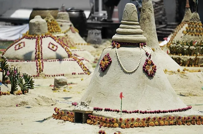 ปกติแล้วประเพณีการก่อกองทรายจะจัดขึ้นในวันใดวันหนึ่งระหว่างวันที่ 13-15 เมษายน ตามความเชื่อคือ หากเมื่อก่อกองทรายแล้วจะได้อานิสงส์ไม่ตกนรก หากเกิดใหม่ก็จะมีเกียรติยศ มีชื่อเสียง แต่ในความจริงแล้วเป็นกุศโลบายเพื่อให้ชาวบ้านขนทรายเข้าวัดเพื่อถมที่ในวัด หรือนำทรายนั้นไปใช้ประโยชน์ต่างๆ ภายในวัด