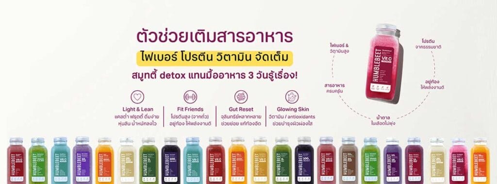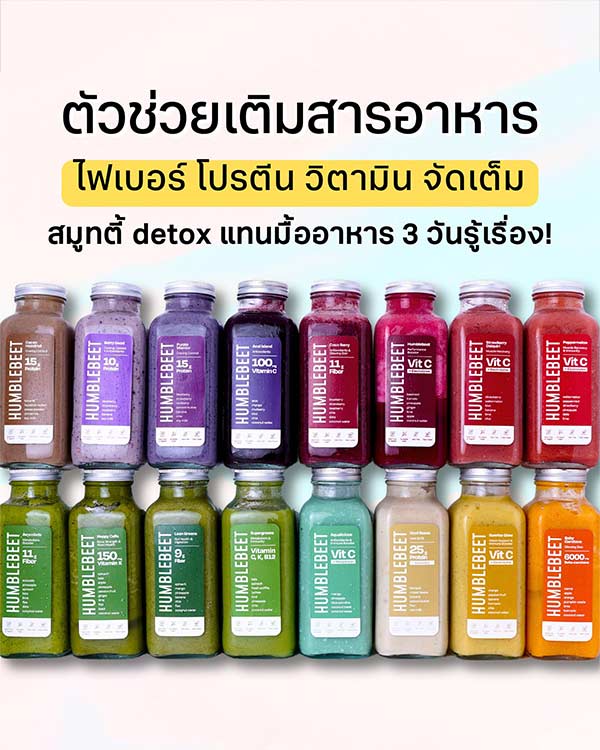แบรนด์ HUMBLEBEET สมูทตี้ที่ช่วย Detox แทนมื้ออาหารเพียงแค่ 3 วัน ก็เห็นผลลัพธ์อย่างชัดเจน ลดความกังวลของการขาดสารอาหาร เพราะทางแบรนด์มีสูตรลับเติมสารอาหารลงในน้ำสมูทตี้อย่างครบถ้วน สารอาหารจัดเต็ม เหมาะสำหรับผู้ที่อยาก Detox สารพิษในร่างกาย และลดน้ำหนักแบบสุขภาพดี นอกจากนี้ ทางแบรนด์ยังมีสมูทตี้หลากหลายรสชาติ หลายสูตร ยังไงก็ไม่มีเบื่อแน่นอน
