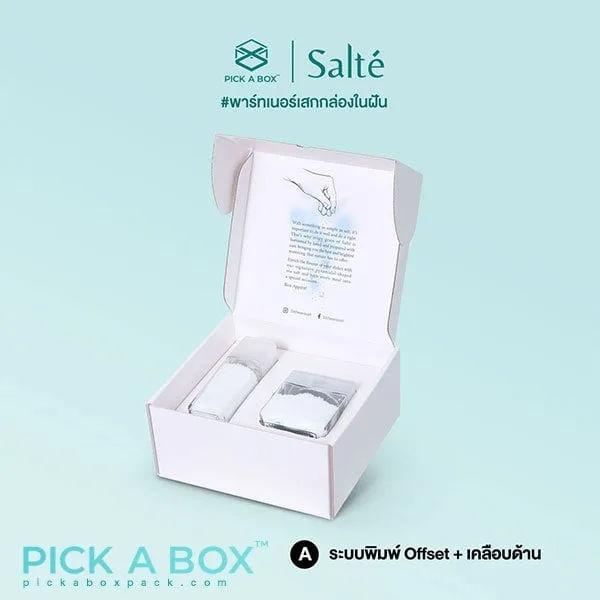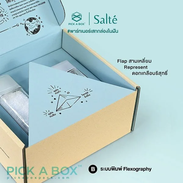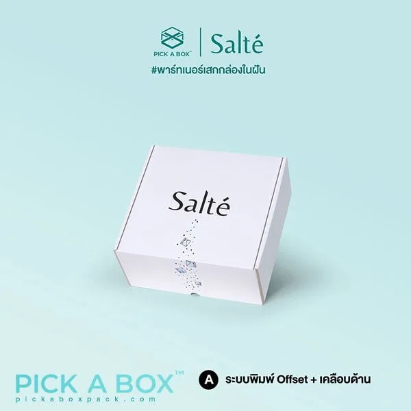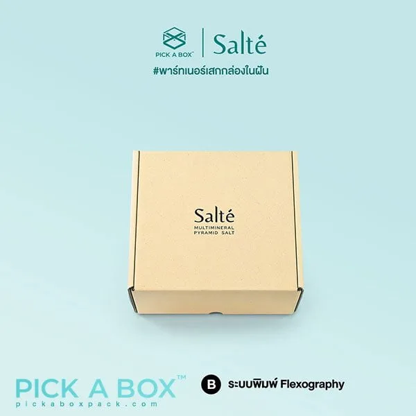 แบรนด์ Salté ผลิตและจัดจำหน่ายดอกเกลือทะเลบริสุทธิ์ รูปทรงพีระมิด คุณภาพพรีเมี่ยม ระดับเชฟมิสชินสตาร์เลือกใช้ ขายผ่านหน้าร้าน Supermarket ชั้นนำ ท้อปส์ กูร์เมต์ มาร์เก็ตวิลเลจ และพร้อมส่งตรงถึงบ้านผ่านช่องทางออนไลน์ Website, Line Official, Facebook และ Instagram แบรนด์ Salté จึงได้มองหาพาร์ทเนอร์โรงงานผลิตกล่อง ที่สามารถออกแบบกล่องและผลิตกล่องสำหรับใส่ขวดและกระปุกแก้วใส่ดอกเกลือ ค่อนข้างมีน้ำหนัก โดยมีความต้องการกล่อง + SuperLock 2 แบบ ที่ช่วยล็อคขวดเกลือป้องกันไม่ให้หลุดออกจากกล่องหรือแตกได้