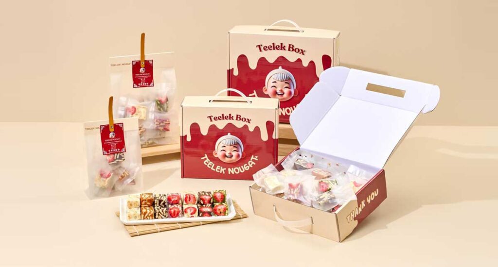 แบรนด์ Teelek Nougat (ตี๋เล็กนูกัต) มองหาโรงงานที่จะมาช่วยดูแลการผลิตกล่องที่ให้บริการครบวงจร สามารถตอบโจทย์ของแบรนด์ได้ทั้งการออกแบบจัดวางกราฟิก ดีไซน์แบบกล่อง จึงเลือกเข้ามาปรึกษาทีมงานของ PICK A BOX เพราะด้วยความมืออาชีพที่ดูแลกล่องกระดาษให้แบรนด์สินค้าต่างๆ ทั้งแบรนด์สินค้าในประเทศ และต่างประเทศ มามากกว่า 3,000 แบรนด์ pickaboxpack : ลูกค้าของเรา